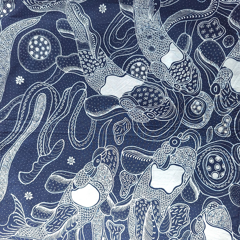 When dipped into dye, only the uncovered, raw fabric takes on the color. After dyeing, the wax is gently melted off, revealing the preserved design beneath