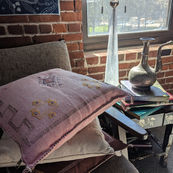 Soft rose pink meets vibrant hand-embroidered symbols inspired by desert traditions. Woven from lustrous cactus silk, the pillow shimmers subtly as light catches its surface. Both playful and elegant, it brings a refreshing splash of color while carrying the centuries-old language of Moroccan textile motifs.