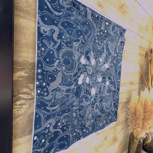 Flowing currents and graceful koi fish come alive in indigo tones, a testament to the meditative beauty of Javanese batik. Each hand-drawn line captures movement and harmony, while traditional wax-resist dyeing creates intricate details that shimmer across the fabric. A statement piece that embodies both balance and the rhythm of water in Indonesian art.