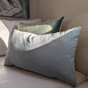 Cool cobalt tones and a modern geometric pattern give this design a calm, tailored vibe. Use it to ground bolder prints or to add quiet structure to a layered pillow story.