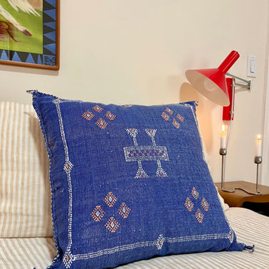 An indigo-inspired blue base holds striking embroidered designs in coral and white. Symbolic of strength and protection in Moroccan textile tradition, the motifs add depth and intrigue to this luminous pillow. Its bold hue makes it a statement piece that anchors any seating arrangement.